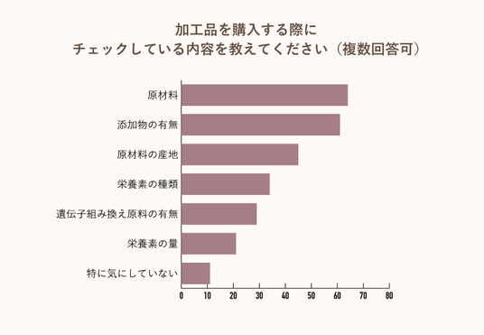 お店で加工品を購入する際にチェックしている内容については、- 原材料:64名(66.0%)