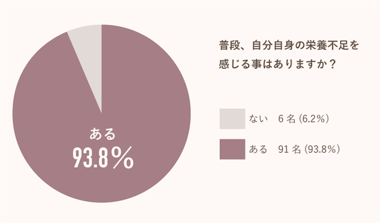 「普段、自分自身の栄養不足を感じることはありますか?」という質問に対し、91名(93.8%)が「ある」と回答しました。