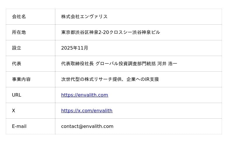 「日本には、世界をリードする力を持った企業がまだ数多く眠っています。しかし、その価値を伝える“語り部”が構造的な限界を迎えているために、正当な評価を得られていないのが現状です。ENVALITH(エンヴァリス)では、テクノロジーの力でそのバトンを繋ぎ、日本企業の価値を、より国内外の機関・個人投資家に理解され、評価されるようにしていきたい。すべての企業に等しく光が当たる、新しい資本市場のインフラを創り上げてまいります」。本件に関するお問い合わせ先