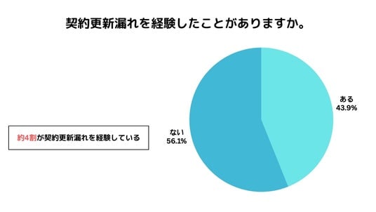 契約更新漏れを「経験したことがある」と回答した人は43.9%(3人に1人以上)にのぼり、さらに契約管理の属人化について「よくある(24.6%)」「時々ある(41.5%)」と感じている人は合計66.1%となりました。