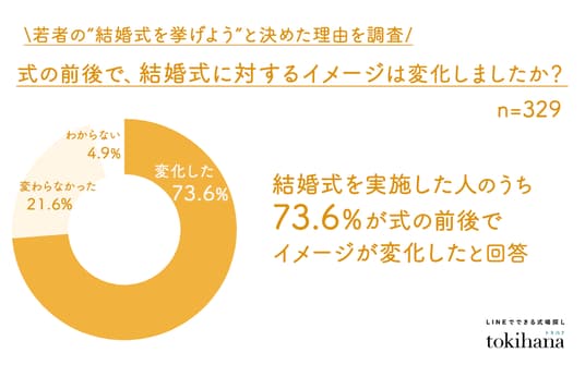 結婚式を挙げる前と後で、結婚式に対するイメージの変化について尋ねたところ、73.6%が「変化した」と回答しました。