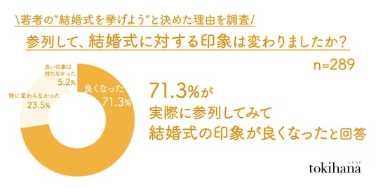 調査の結果、結婚式の参列経験を通じて「結婚式に対する印象が良くなった」と回答した人は71.3%にのぼりました。