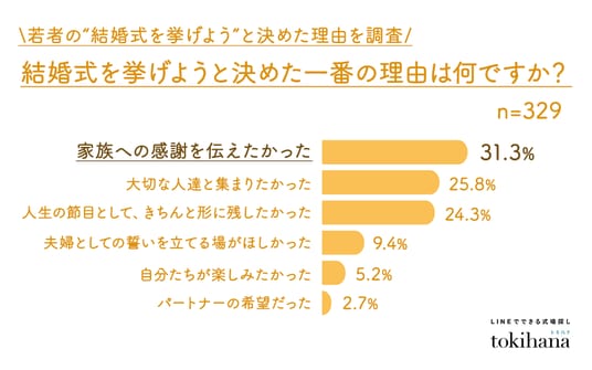 LINEでできる式場探しサービス『トキハナ(https://tokihana.net/)』を運営する株式会社トキハナ(本社:東京都港区、代表取締役社長:安藤 正樹)は、2024~2026年に結婚式を実施した20~30代の男女329名を対象に、「結婚式を挙げようと決めた理由」に関する調査を実施しました。