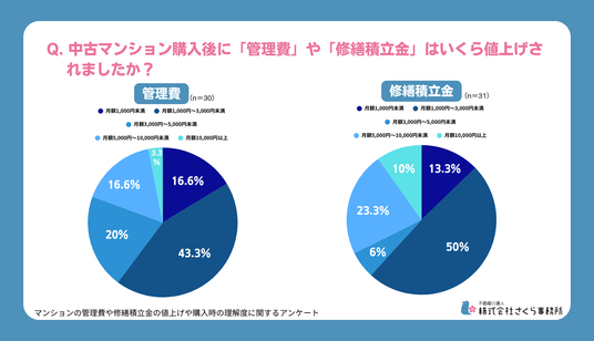 個人向け総合不動産コンサルティング・ホームインスペクション(住宅診断)、マンション管理組合向けコンサルティングを行う“不動産の達人 株式会社さくら事務所”(東京都渋谷区/社長:大西倫加)は、中古マンションを購入した方を対象に、マンションの管理や修繕積立金の値上げや購入時の理解度に関するアンケートを実施しました。本件に関する取材やご質問がございましたらお気軽にお問い合わせください。