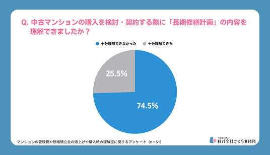 購入時に長期修繕計画を確認した方のうち「十分理解できた」と回答したのは、わずか25.5%に留まります。つまり、全体で見ると購入時に長期修繕計画を十分理解できたのは約13%(51%のうちの25.5%)で、約87%は長期修繕計画を理解しないまま中古マンションを購入しているということになります。