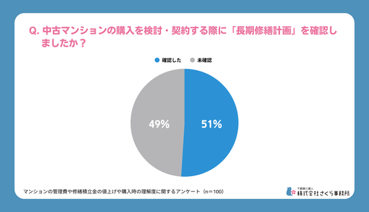 中古マンション購入時に長期修繕計画を確認したと回答した方は、約半数。「未確認」と回答した方の中には「そもそも存在を知らなかった」という声も少なからず見られました。