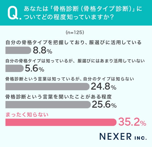 結果として、最も多かった回答は「まったく知らない」で35.2%でした。次いで「骨格診断という言葉を聞いたことがある程度」が25.6%、そして「骨格診断という言葉は知っているが、自分のタイプは知らない」が24.8%となっています。