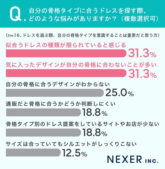 「似合うドレスの種類が限られている」と「気に入ったデザインが自分の骨格に合わないことが多い」がともに31.3%で最多でした。