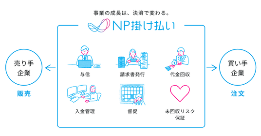 「NP掛け払い」は、企業間取引(BtoB)向けの後払い決済サービスです。当社が売り手企業と買い手企業の間に入り、買い手企業への与信から請求書発行、代金回収までの決済・請求業務全てを請け負います。NP掛け払いの導入により、売り手は決済・請求業務をまるごとDX化し、本来業務により集中できます。また未回収リスクの保証もするため、経営基盤の安定化を図れます。さらには、従来の信用機関に依存しない独自の与信審査によって、個人事業主を含む事業者に対して与信通過率99%(※1)と柔軟に掛け売りを提供することができ、販路拡大・売上向上が見込めます。買い手は掛け払いを利用することで、キャッシュフローの改善を期待できます。