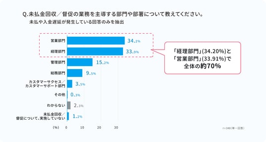 未払い金回収・督促を主導する部署は、経理(34.2%)と営業(33.9%)で計約7割を占めました。