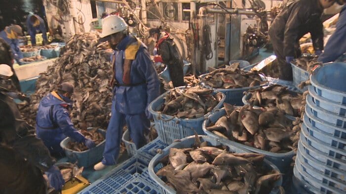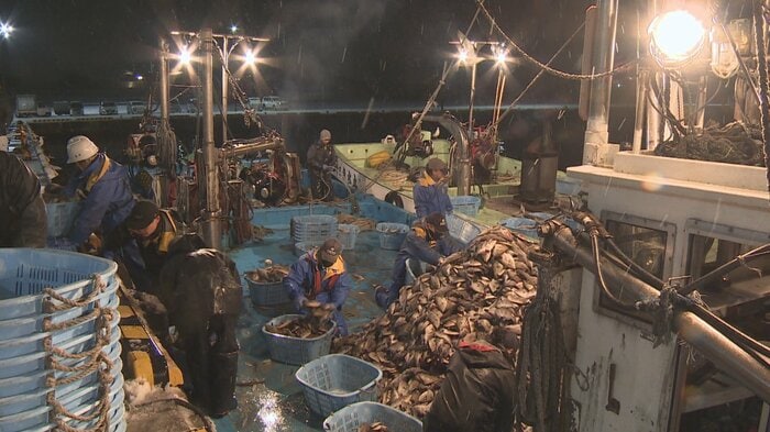 「午前5時の魚津漁港です。山積みになった寒ハギが『せーの』の掛け声と共にどんどん陸に上がっていきます」