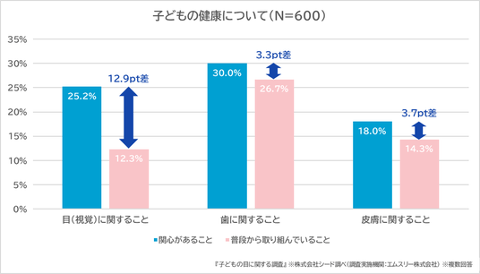 「子どもの健康」について、「関心があること」で「目(視覚)に関すること」と回答した保護者は、25.2%であったのに対し、「普段から取り組んでいること」で「目(視覚)に関すること」と回答した保護者は、12.3%にとどまり、その差は12.9ポイントに達しました。一方、「歯に関すること」では関心と取り組みの差は3.3ポイントになりました。