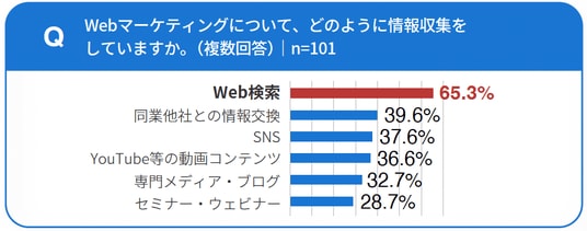 「Webマーケティングについて、どのように情報収集をしていますか?」と質問したところ、「Web検索(Google、Yahoo!など)」が65.3%で最多 となりました。