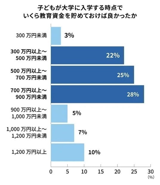 大学生の保護者100名に対して「もし過去に戻れるなら、子どもが大学に入学する時点でいくら貯めておきたかったか」という質問をしたところ、「700万~900万円未満(28%)」が最も多い結果となりました。