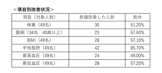 株式会社ルネサンス(本社:東京都墨田区、代表取締役社長執行役員:望月 美佐緒、以下「当社」)は、当社が取り組む健康経営施策である「脂質異常削減プロジェクト」において、「中性脂肪の改善率85.7%」という成果が確認されたことをお知らせいたします。