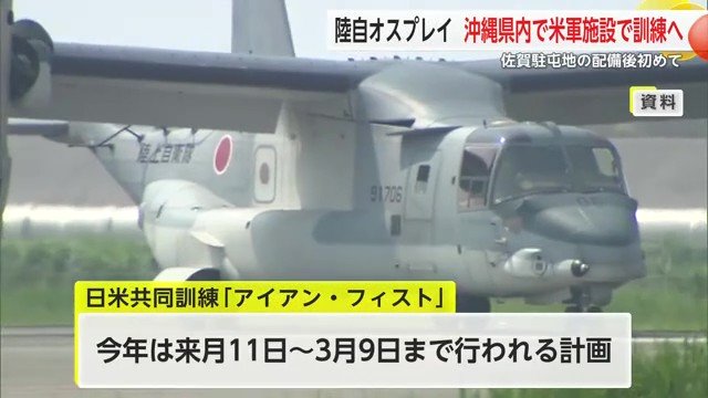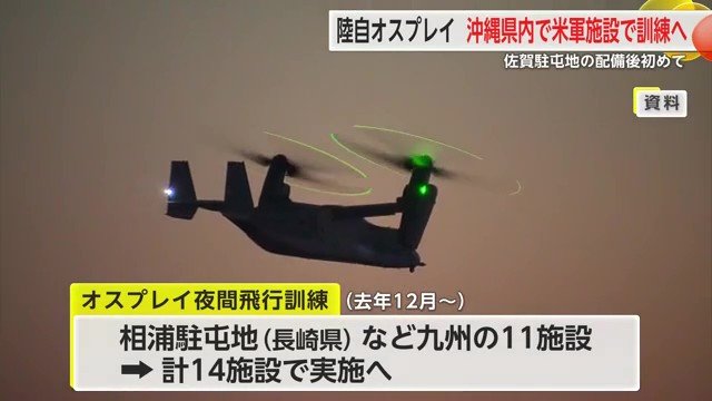陸上自衛隊のオスプレイが2月から行われる「日米共同訓練」に参加する計画が明らかになった。佐賀駐屯地への配備後にアメリカ軍の施設で訓練が行われるのは初めて。また長崎県の離島では夜間飛行訓練を実施する。