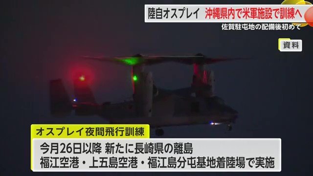 一方、オスプレイの夜間の飛行訓練について防衛省は、1月26日以降、新たに長崎県の離島にある福江空港と上五島空港、福江島分屯基地着陸場で離着陸と周辺の飛行を実施することを明らかにした。