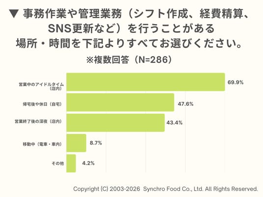 こうしたアナログ管理の負担は、経営者の私生活をも浸食しています。事務作業を行う場所・時間を聞いたところ、「営業中のアイドルタイム(69.9%)」に次いで、「帰宅後や休日(47.6%)」、「営業終了後の深夜(43.4%)」という回答が多く挙がりました。