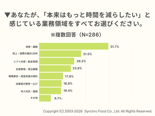 さらに、「本来はもっと時間を減らしたい」と感じている業務領域を聞いたところ、最も多かったのは「清掃・雑務(51.7%)」、次いで、「売上・経費の集計/分析(31.5%)」、「シフト作成・勤怠管理(26.2%)」、「在庫管理・発注業務(23.8%)」と続く結果になりました。