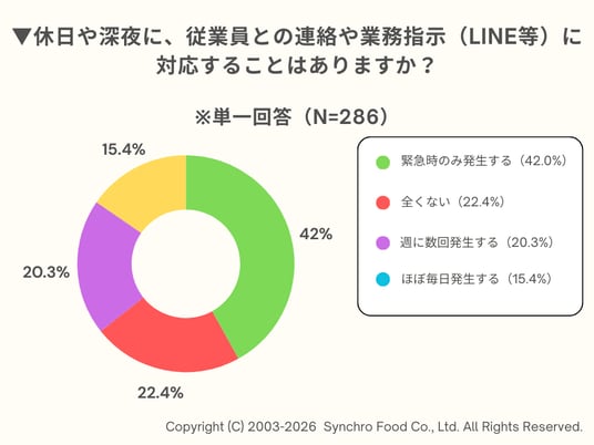 また、休日や深夜に従業員からの連絡に対応することがあるかという問いには、約35%が「毎日~週数回発生する」と回答。店舗にいなくとも業務から離れられない「隠れた長時間労働」が常態化していると言えます。
