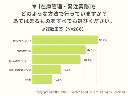 同様に、「在庫管理・発注業務」においても、「紙やホワイトボード(35.7%)」が最多となり、ITツールの導入率は29.0%という結果に。