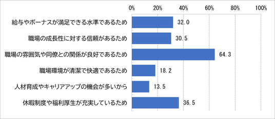 働き続けたいと回答した従事者について、働き続けたい理由として【職場の雰囲気や同僚との関係が良好であるため(64.3%)】との回答が最も多い結果となった。次いで【休暇制度や福利厚生が充実しているため(36.5%)】、【給与やボーナスが満足できる水準であるため(32.0%)】などが続いた。