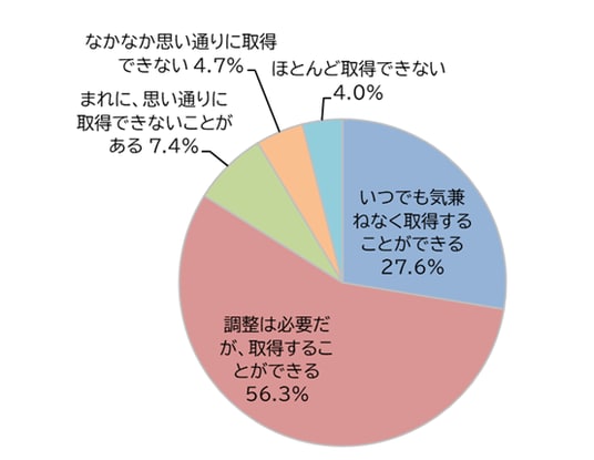 “勤務先での有給休暇の取得しやすさについて、あてはまるものを1つ選択してください”という設問について、【いつでも気兼ねなく取得することができる(27.6%)】と【調整は必要だが、取得することができる(56.3%)】の合計が全体の8割超となっている。