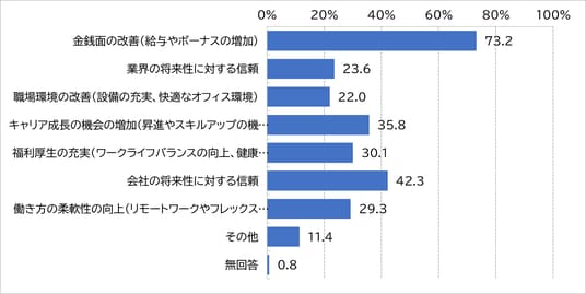 “今後、何が変われば今の会社で働き続けたいと思いますか”の設問では、働き続けたいと回答した従事者の意見と同様、【金銭面の改善(給与やボーナスの増加)(73.2%)】と回答した割合が最も高い結果となった。