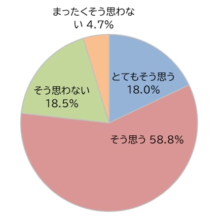 “現在働いている会社で働き続けたいと思いますか”という設問について、働き続けたい(とてもそう思う+そう思う)との回答が約8割(76.8%)を占めている。【そう思わない】と回答した割合は18.5%、【まったくそう思わない】は4.7%となっている。