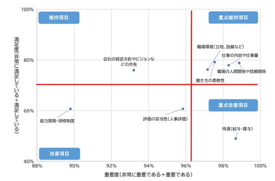「会社の経営方針やビジョンなどの共有」の選択肢は、満足度は高いものの重要度はやや低くなっている。