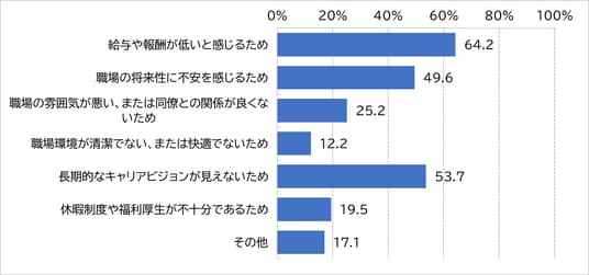 働き続けたくないと回答した従事者について、働き続けたくない理由は【給与や報酬が低いと感じるため(64.2%)】と回答した割合が最も高く、次いで【長期的なキャリアビジョンが見えないため(53.7%)】、【職場の将来性に不安を感じるため(49.6%)】などが続いた。