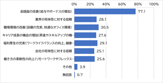 “今後、何を改善すれば今の会社でより働き続けたいと考えますか”の設問では、【金銭面の改善(給与やボーナスの増加)(77.1%)】を求める意見が多く見られた。