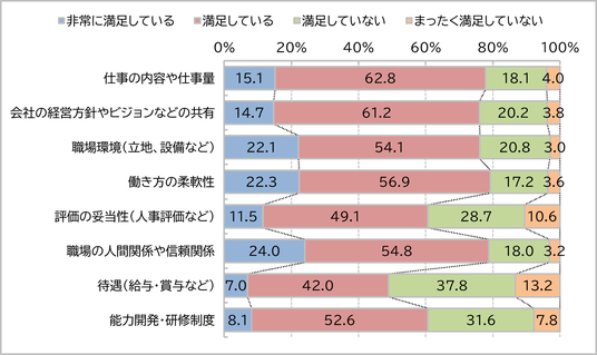 待遇以外にも、「評価の妥当性」「能力開発・研修制度」については、他の項目と比べて満足度が低く、体系的な研修制度や評価基準の見直しを行い、スキルアップの機会をつくることや、定期的に人事評価を実施することで、従業員が自社や業界内で長期的にキャリアを形成できるビジョンを示すことが重要となります。