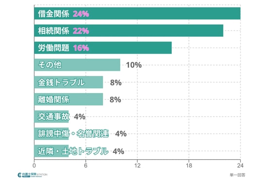 弊社が実施した「弁護士への相談実態調査」によると、現代人が直面するトラブルの傾向が浮き彫りになりました。- 相談内容の「三難」: 「借金関係(約24%)」「相続関係(約22%)」「労働問題(約16%)」がトップ3。生活に直結する深刻な悩みが上位を占めています。