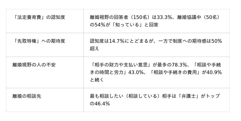 父母の離婚後の養育費についてのルールが変わります。現在、養育費の未払いや不払いで生活が困窮する家庭が問題になっていますが、この新制度により、こどもの利益を確保することや、親の責務が明確になることが期待されます。離婚時に取り決めがなくても子ども1人当たり月額2万円を請求できる「法定養育費」や、養育費を優先的に差し押さえることのできる「先取特権」(上限子ども1人当たり月額8万円)が導入されます。今回、改正民法施行の2026年4月を前に、制度を利用する可能性の高い層(離婚協議中の人・離婚検討中の人)を中心に意識調査を行いました。■ 調査概要