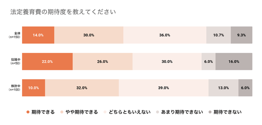 一方、期待度については、法定養育費より高い回答でした。離婚視野の該当者(150名)全体で「期待できる」「やや期待できる」の合計は50.7%と半数を超えました。