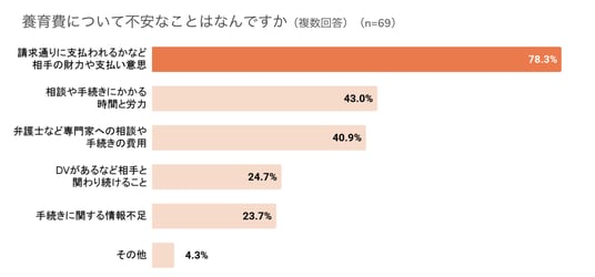 離婚視野の回答者のうち、養育費を受け取る側となる予定と答えた69名に『養育費について不安なこと』を複数回答で尋ねたところ、「相手の財力や支払い意思」が最多の78.3%、「相談や手続きの時間と労力」43.0%、「相談や手続きの費用」が40.9%と続きました。養育費がきちんと支払われるかの確証がないなかで、先行きに不安を抱えていることがわかります。