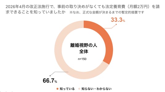 離婚視野の回答者(150名)に『法定養育費の制度について知っているか』を尋ねたところ、33.3%が「知っている」、66.7%が「知らない・わからない」と回答しました。このうち離婚協議中の50名に絞ると、認知度は54.0%と過半数でした。実際に手続きに入っている人たちにとっては、自身の生活に直結する制度だということが推測されます。