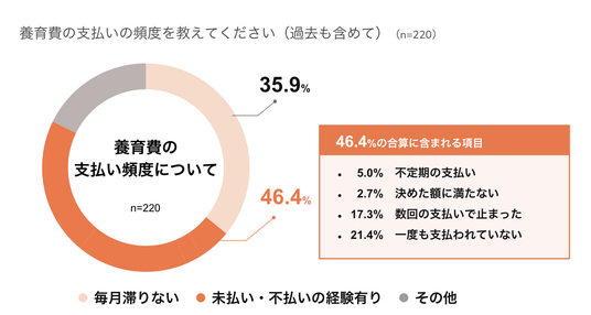 今回、離婚経験者の回答も分析しました。養育費を受け取っている、受け取っていた経験がある離婚経験者(220名)に養育費の支払い頻度について尋ねたところ、46.4%(102名)が養育費の未払いや不払いの経験があったことがわかりました。