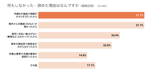 離婚経験者で未払い・不払いに遭った経験があり「何もしなかった・諦めた」と答えた41名に、その理由を複数回答で尋ねたところ、「手続きが複雑で時間がかかりそうだったから」「相手からの報復(DVなど)が怖いから」が31.7%と最多でした。「相手に支払い能力がないとわかっていたから」が24.4%と続きました。