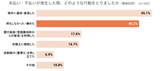 離婚経験者で未払い・不払いの経験があると答えた102名に、『どのような行動をとったか』を複数回答で尋ねました。このうち「何もしなかった・諦めた」という、いわゆる“泣き寝入り”した人が40.2%でした。一方、履行勧告を利用したり、弁護士に相談したりするなど専門的な手続きに進んだ人は20%弱にとどまりました。