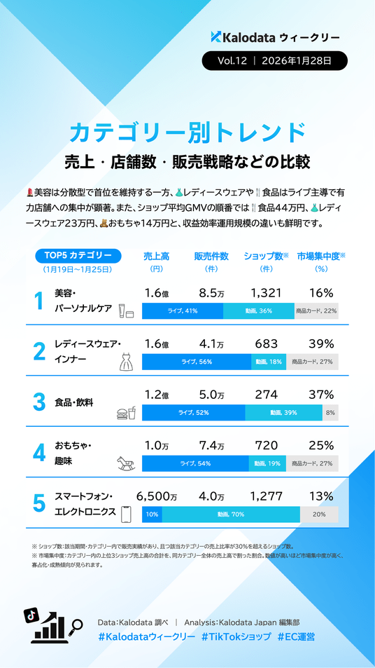 Kalodata Japan(運営:株式会社Kalowave Japan)の最新データ分析によると、2026年1月19日~1月25日の日本TikTok Shop市場はGMV9.97億円(前週比-2%)と微減となりました。動画本数およびライブ配信者数はいずれも前週比+4%と増加した一方、広告投資額や売上が発生した商品数は伸び悩み、投稿量の増加が売上成長に直結しない状況が続いています。市場全体では、量的拡大よりも転換設計・導線設計の完成度が成果を左右する局面がより明確になりました。カテゴリー別では、美容・パーソナルケアが分散型構造を維持し首位を継続する一方、レディースウェアおよび食品・飲料はライブ主導で一部有力店舗への集中が顕著でした。また、1店舗あたりの週間平均GMVでは、食品・飲料が約44万円、レディースウェアが約23万円、おもちゃ・趣味が約14万円と差が見られ、カテゴリーごとに求められる運用規模や収益効率の水準が異なることが改めて浮き彫りとなっています。