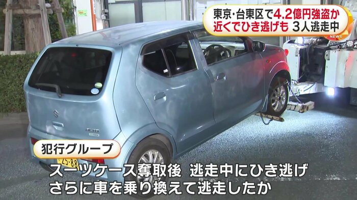 警視庁は、犯行グループがスーツケースを奪った後、逃走中にひき逃げ事件をおこし、さらに車を乗り換えて逃走したとみて捜査している。