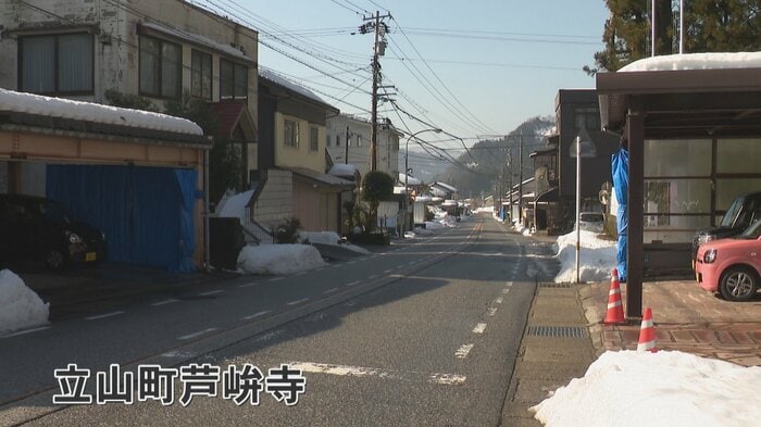 立山町芦峅寺地区。この地区では約3分の1の住宅で、車庫にブルーシートがカーテンのように掛けられている。立山黒部アルペンルートに通じる県道沿いに点在するこの光景の謎を調査した。