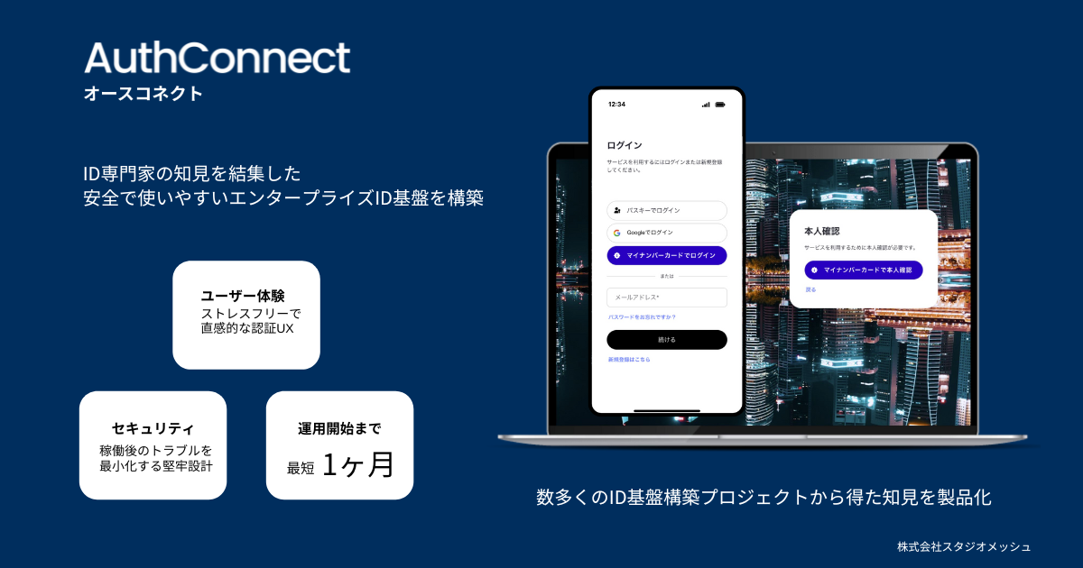 株式会社スタジオメッシュは“誰もが安全簡単にログインできる世界を実現する”というミッションを掲げて設立された会社です。【ログインの未来を創るスタジオメッシュストーリー(全3部)】の第2部では、具体的にどのようなサービスを通して、どのような価値を届けているのかを、開発代表取締役・清田雄平氏と開発チームリーダー・松井浩司氏に語っていただきました。