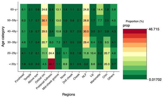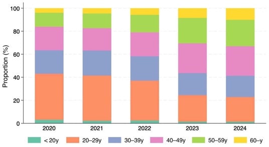 研究期間を通じて、年間患者数は一貫して増加した。患者背景には顕著な変化が認められ、2020~2022年には20代が最多であったのに対し、2023年以降は40歳以上の患者の割合が著明に増加し、全症例の半数以上を占めるようになった。治療選択は年齢によって明確に異なり、若年層では局所的な外見形成(涙袋、顎)が好まれる一方、中高年層では複数部位に対する若返り治療が必要とされる傾向があった。2024年には眼窩縁が最も頻繁に治療される部位となった(22.6%)。