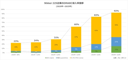 - 推奨される最高レベルのDMARC認証(Reject)を導入している日経225企業は、昨年の7%から倍増したものの、わずか15%にとどまっている。