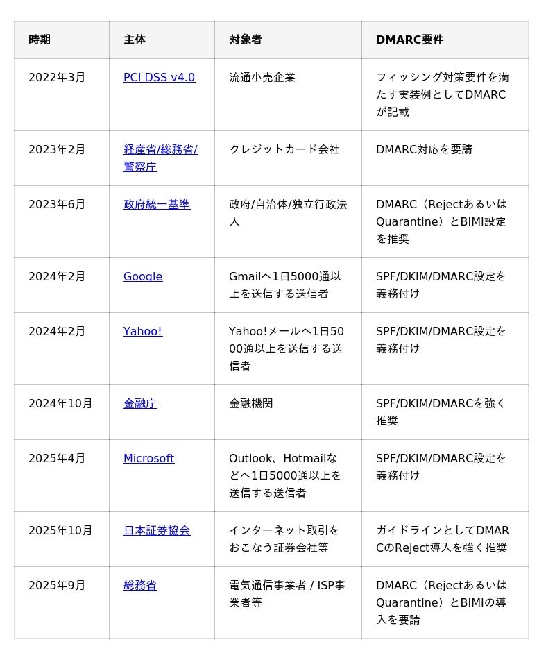以下にまとめた通り、政府や各業界団体、メールプラットフォーム事業者が詐欺メール対策として次々にDMARC認証への対応を要請しています。