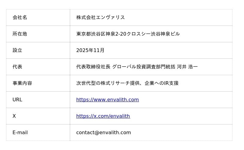 「独自のニッチトップ戦略で新たな市場を切り拓くMUSCATのリサーチを開始できることを大変嬉しく思います。一つの房に多くの実が成るマスカットのように広がる同社の多様な価値を、テクノロジーの力で“語り部”として世界へ届けることは、まさにエンヴァリスが目指す資本市場のアップデートそのものです。今回のカバレッジを通じて、MUSCATの本質的な価値を世界へ伝え、日本市場の活性化に寄与してまいります。」本件に関するお問い合わせ先