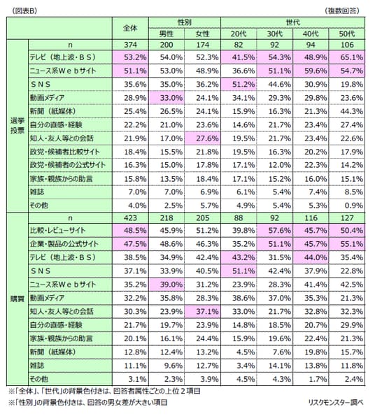 選挙投票時の参考情報は全世代でテレビ・ニュース系Webサイトの回答率が高く、若い世代ではSNSも主要な情報源となっています。一方、購買時には比較・レビューサイトや公式サイトが重視されました。